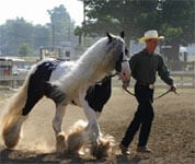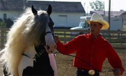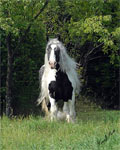 Slainte was imported from Ireland in 2002. He had originally been owned by a true Gypsy that sold him to Pat Cash. To our knowledge Pat owned him long enough to take him to the Irish Cob Society’s inspections, in which he was approved and registered. We were told he received the highest inspection marks up to that point, 2002. We purchased Slainte a little less that one year after he had come to America. Those of you who have met Slainte previously know he has come a long way. (Thank you to all of the nice positive comments we have received from individuals telling us so. We very much appreciate it!) Since our aquiring of Slainte, he has gone on to be chosen to represent DAC Mineral company, take top honors at the largest show to date for the Gypsy Horse, The Gypsy Vanner Society’s show at the Ohio State Fair. Currently he is one of only a very few Gypsy Horse stallions that are succesfully shown and competed. Who knows…Slainte may even have a few more announcements coming…keep checking!!